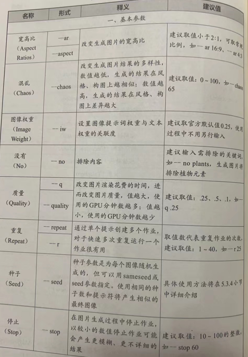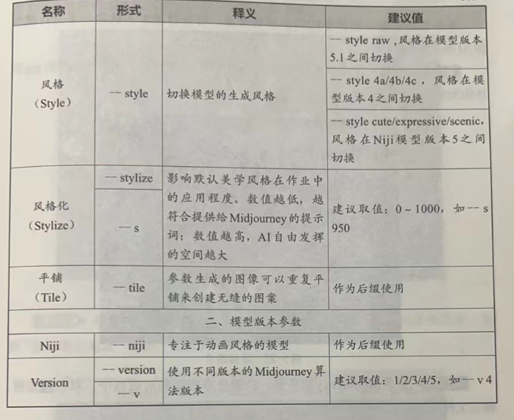 前文中列举了多种用于形容图片内容的关键提示词,除此之外,Midjourney还可通过一系列后缀参数对图片进行更精确的调控,后缀参数的基本结构为“--后缀名+空格+参数值”(均采用小写,如-ar ),下面将对常用后缀名关键词进行归纳,如表5-7所示。