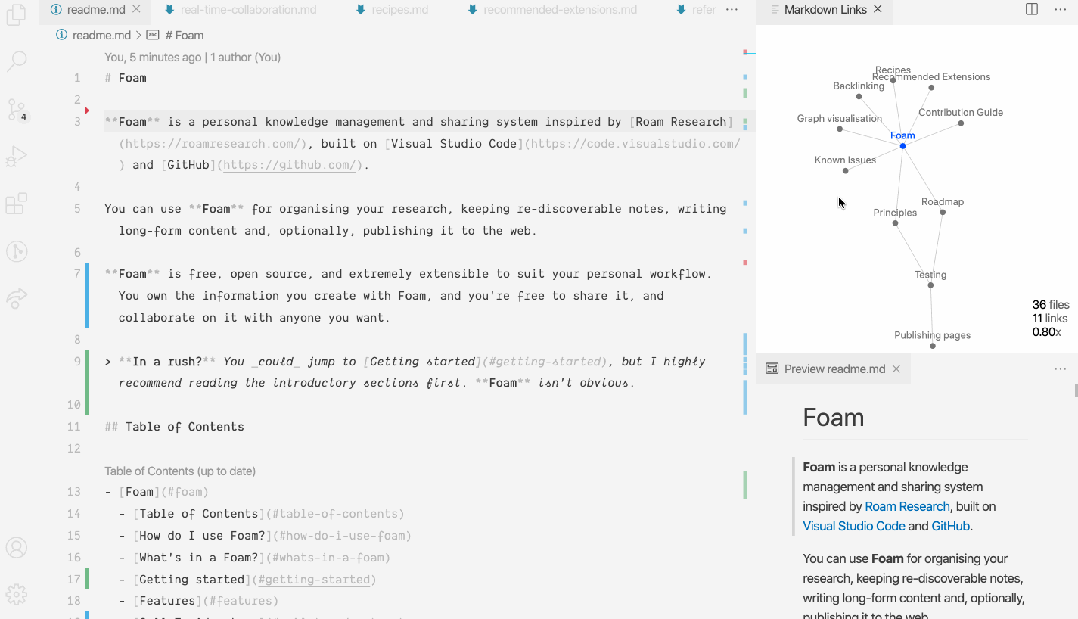 Foam 允许你创建一个单一的工作空间,将所有相关的知识和研究集中在一起。你可以将不同的主题和项目放在不同的 Markdown 文件中,方便随时查阅和更新。