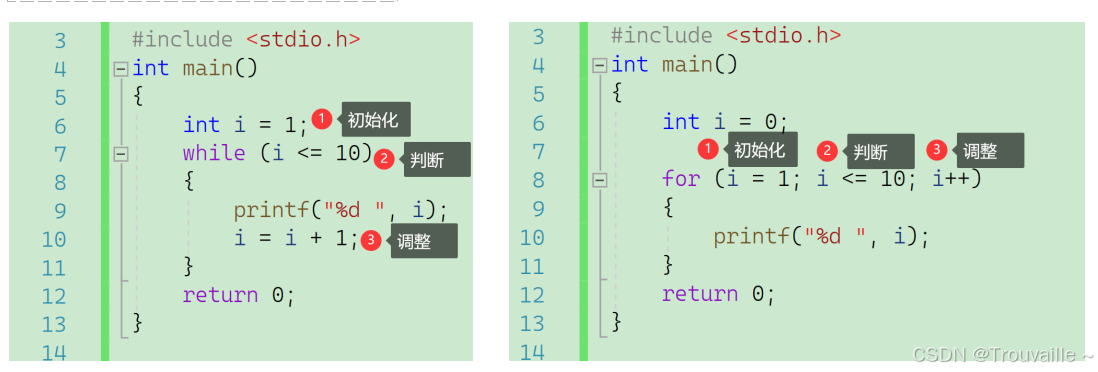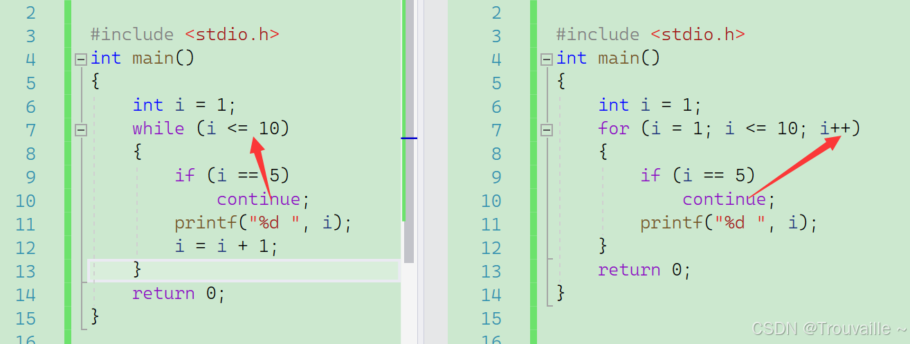 在这⾥我们也可以对⽐⼀下 while 循环和 for 循环中 continue 的区别:
