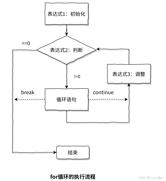 ⾸先执⾏ 表达式1 初始化循环变量,接下来就是执⾏ 表达式2 的判断部分, 表达式2 的结果如果 ==0,则循环结束; 表达式2 的结果如果!=0则执⾏循环语句,循环语句执⾏完后,再去执⾏表达式3 ,调整循环变量,然后再去 表达式2 的地⽅执⾏判断, 表达式2 的结果是否为0,决定循环是否继续。