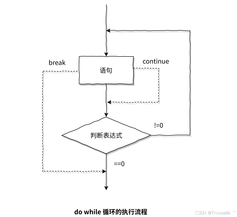 在 do while 循环中先执⾏图上的“语句”,执⾏完语句,再去执⾏“判断表达式”,判断表达式的结果是!=0,则继续循环,执⾏循环语句;判断表达式的结果==0,则循环结束。