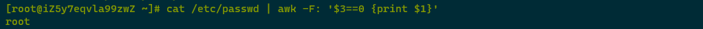 使用cat /etc/passwd | awk -F: '3==0 {print 1}'命令排查UID是0的超级权限账户,发现只有root,未发现异常账户。