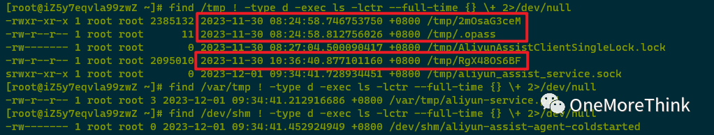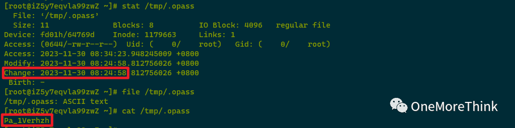 005、/tmp/.opass文件于2023-11-30 08:24:58被攻击者创建,从文件名判断是密码本,一般用于解密恶意程序,后续需备份后删除。