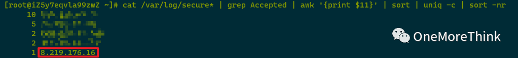 使用cat /var/log/secure* | grep Accepted | awk '{print $11}' | sort | uniq -c | sort -nr命令,发现恶意IP地址8.219.176.16成功登录过一次SSH。