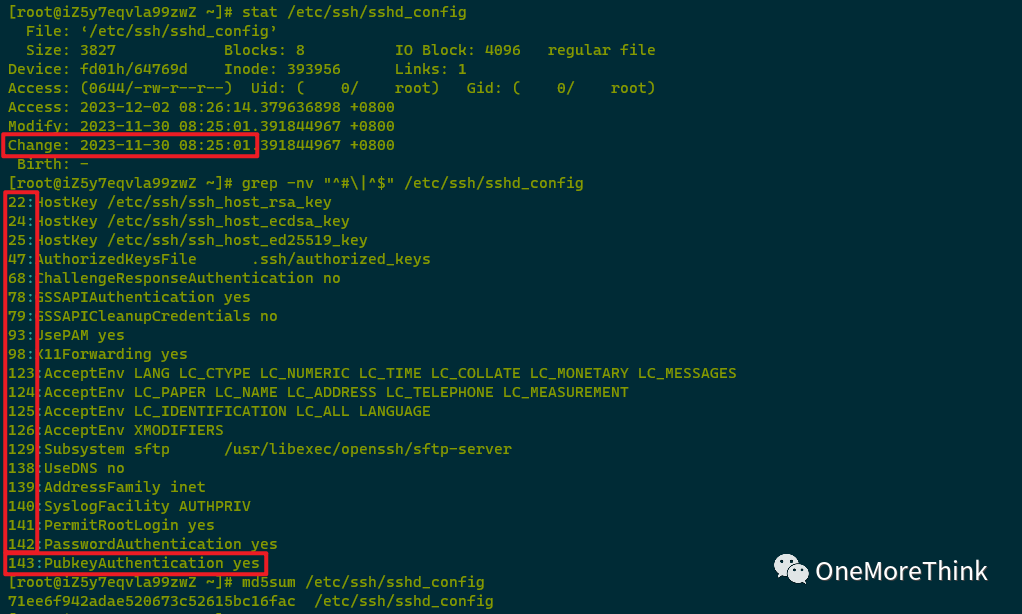 008、/etc/ssh/sshd_config文件于2023-11-30 08:25:01被攻击者篡改,对比配置相同的其它正常服务器的sshd_config文件多了PubkeyAuthentication yes配置,是攻击者为了公钥登录而添加的。后续若无公钥登录需求,需删除该配置。