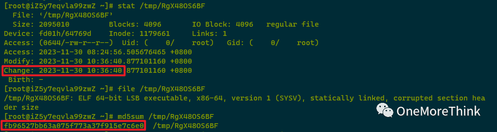 006、/tmp/RgX48OS6BF文件于2023-11-30 10:36:40被攻击者改过,但从atime看2023-11-30 08:24:56就被创建,经文件沙箱检测是恶意程序,后续需备份后删除。