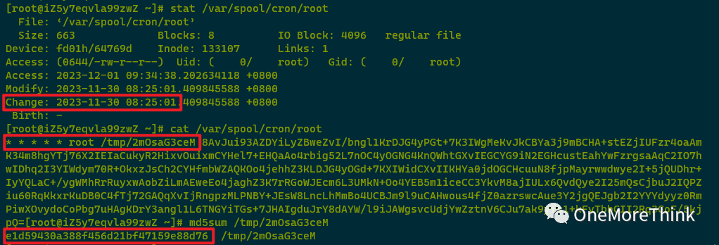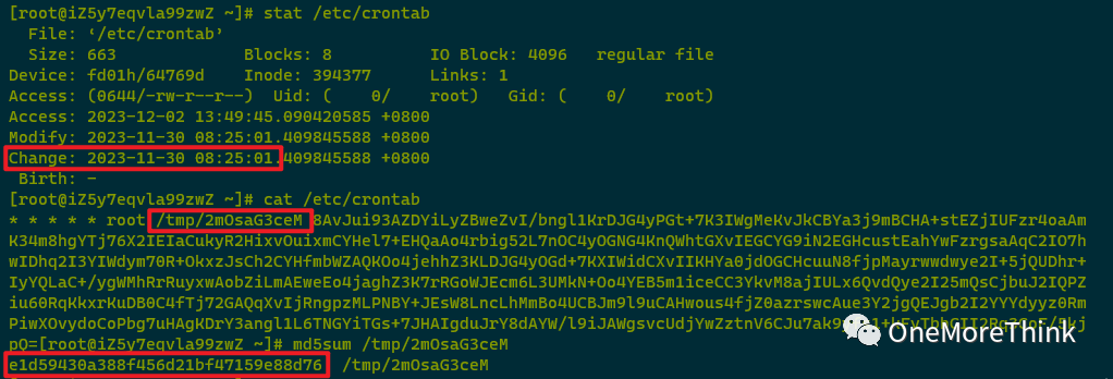003、/var/spool/cron/root文件于2023-11-30 08:25:01被攻击者篡改,添加了执行恶意程序的计划任务。后续需备份后删除计划任务/var/spool/cron/root、备份后删除恶意程序/tmp/2mOsaG3ceM。