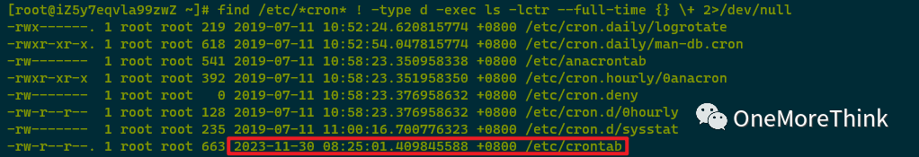 使用find /etc/*cron* ! -type d -exec ls -lctr --full-time {} \+ 2>/dev/null命令排查计划任务,发现/etc/crontab文件于2023-11-30 08:25:01被攻击者篡改。由于已在“恶意程序排查 – 文件排查”时分析过,这里不再分析。
