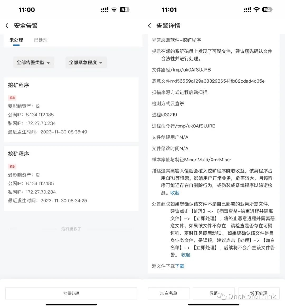 10分钟后,攻击者执行的挖矿程序于2023-11-30 08:34:25被阿里云盾检测到。