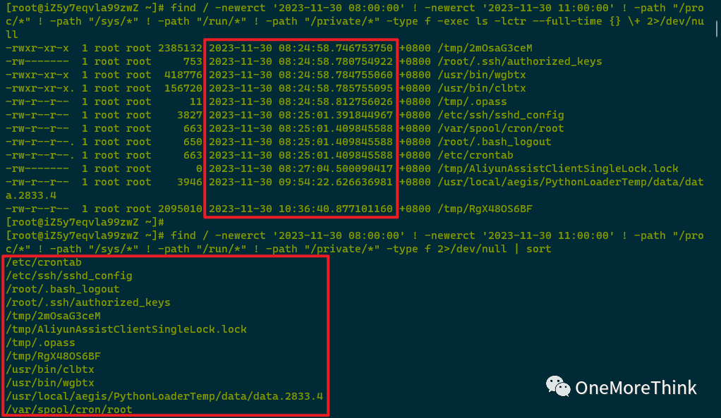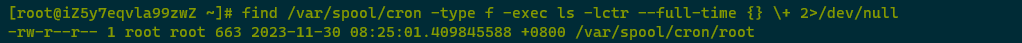 使用find /var/spool/cron -type f -exec ls -lctr --full-time {} \+ 2>/dev/null命令排查计划任务,发现/var/spool/cron/root文件于2023-11-30 08:25:01被攻击者篡改。由于已在“恶意程序排查 – 文件排查”时分析过,这里不再分析。