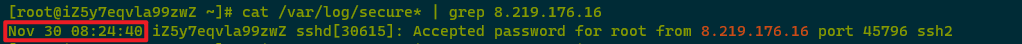 使用cat /var/log/secure* | grep 8.219.176.16命令,查看恶意IP地址的登录时间,是2023-11-30 08:24:40。