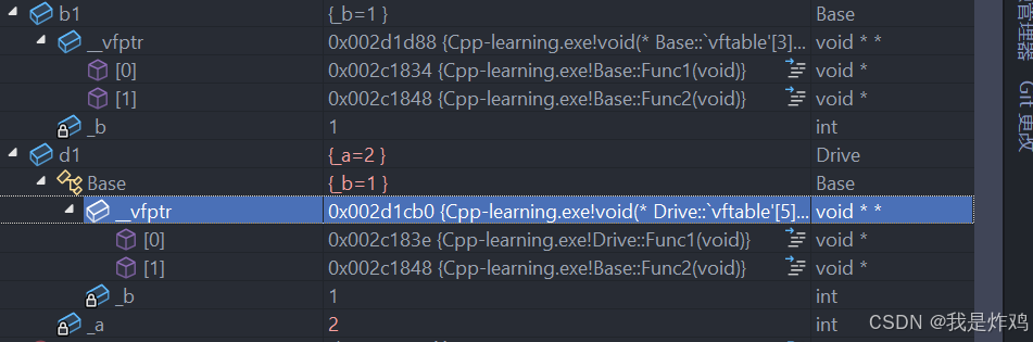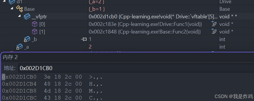第一个也是虚表指针,这个指针指向的就是虚表,当然了,虚表指针同一个程序里面都是一样的,毕竟都是同一个类实例化出来的,函数指针肯定要一样的。