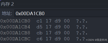 这是指针指向的内容,现在我们用内存2来观察一下这些地址。