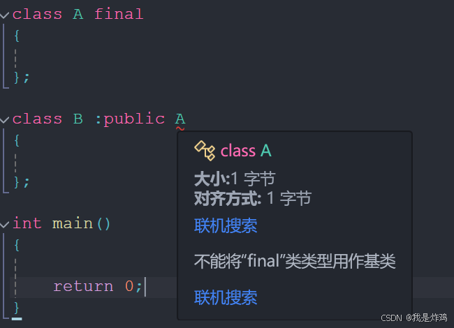final的使用就是这个虚函数不能被重写,final的意思就是最终的意思,也好理解,就是已经到最后了,也就不能重写了: