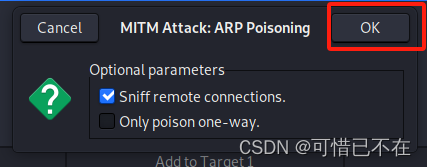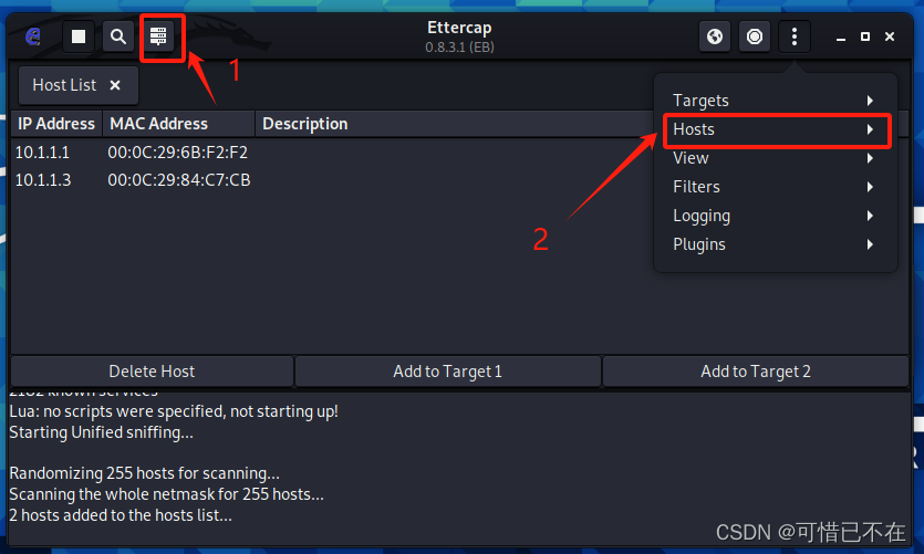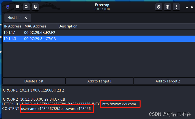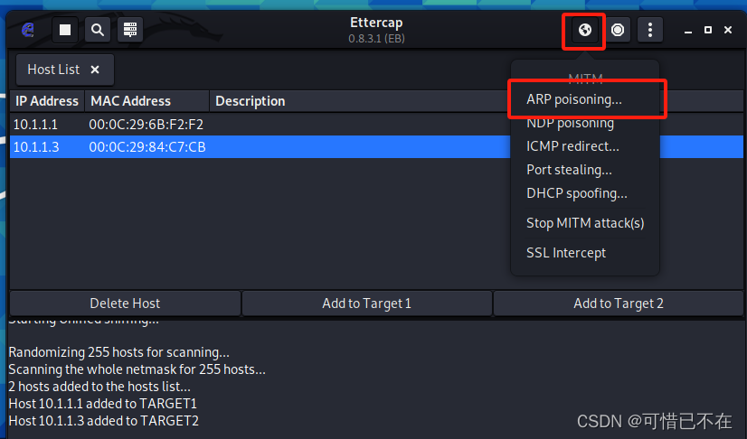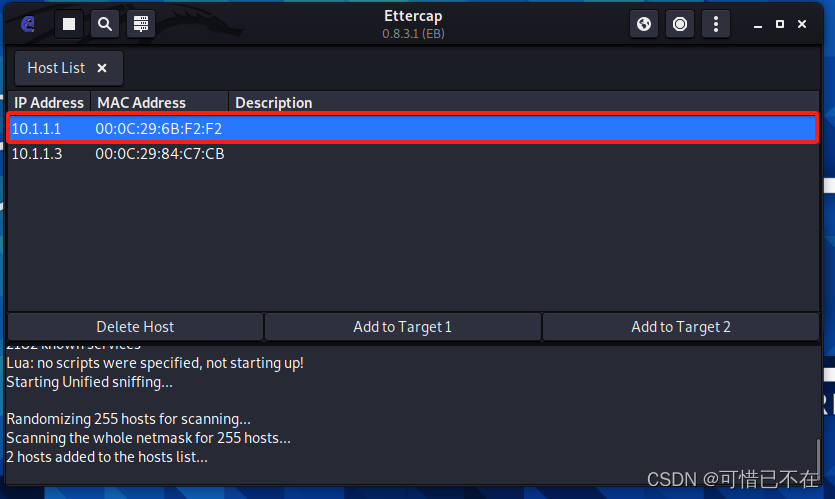 这个时候我们观察到扫描到了,10.1.1.1(客户机),10.1.1.3 (服务器)两个 选择10.1.1.1 点击Add to Target 1 选择10.1.1.3 点击Add to Target 2