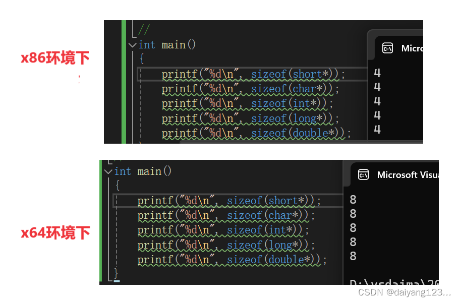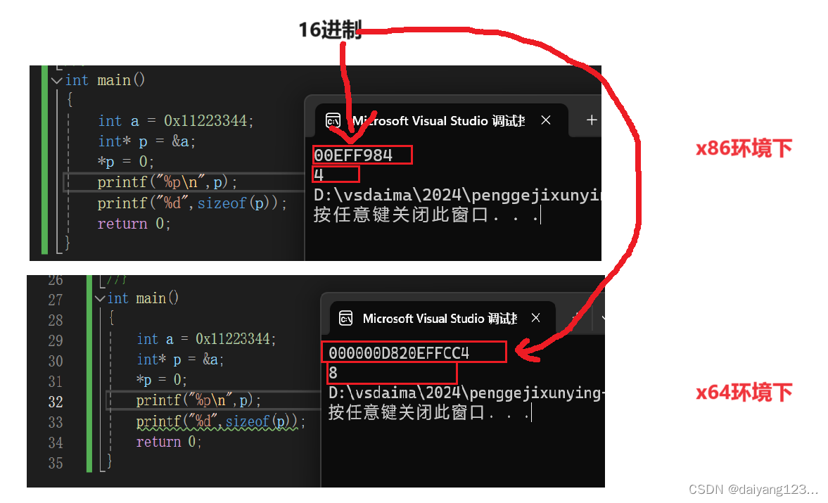 我们可以发现指针变量的大小和类型无关,指针变量的大小由地址的大小决定,跟环境有关。