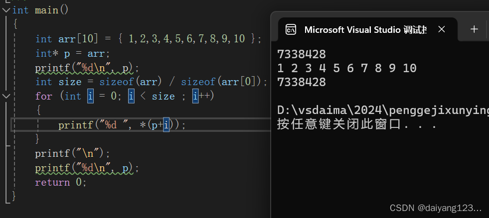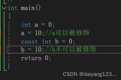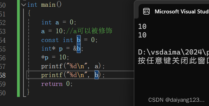 上面图片这段代码,因为b前面加上const所以b变成了变量常量,所以b不能被修改。 如过我们非要修改b的值呢,可不可以呢?怎么办呢? 答案:可以的,我们可以绕过b,借助b的地址去修改,这样就打破了语法限制。 (用b直接修改就就好比是从大门进去,使用b的地址去修改好比是翻窗进入房间) 我们在编译器里面试一试: