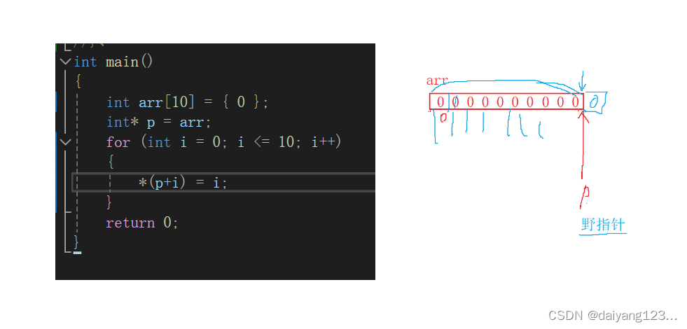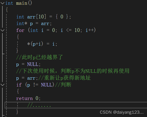指针指向的范围超出了数组arr的范围时候,指针p为野指针。