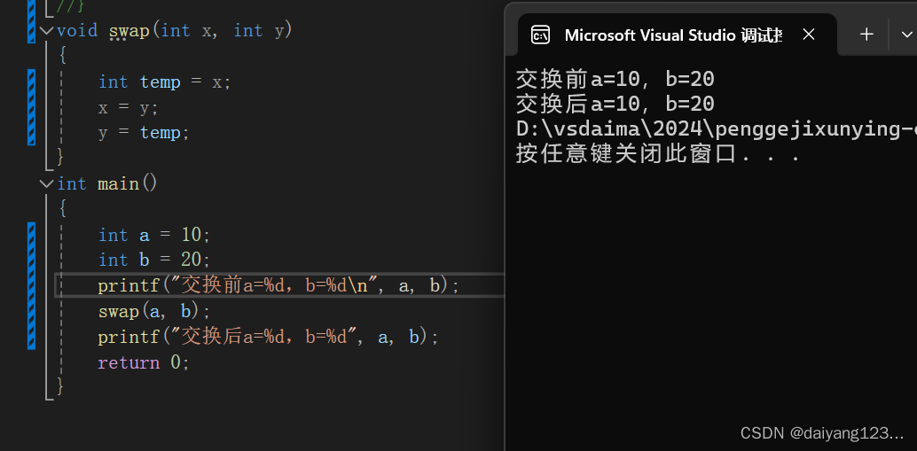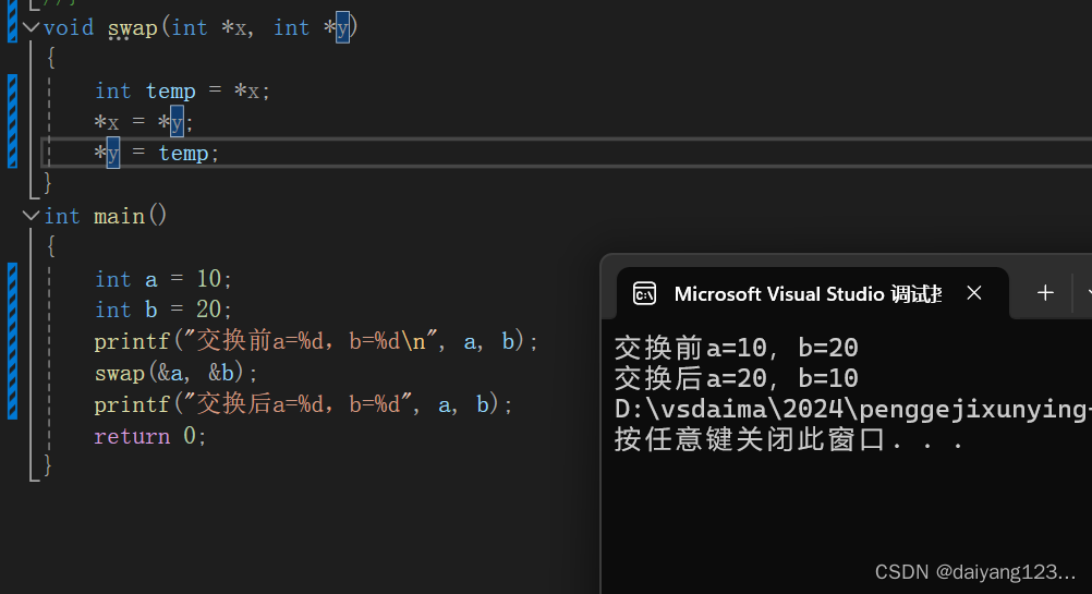 结论:实参传给形参时候,形参会单独创建一份临时空间来接收实参,对形参的修改不影响实参,所以swap是失败的。 那要怎么样才能成功呢? 轮到指针登场了,我们把a和b的地址传参过去,通过地址间接的操作a和b的数值交换 代码如下: