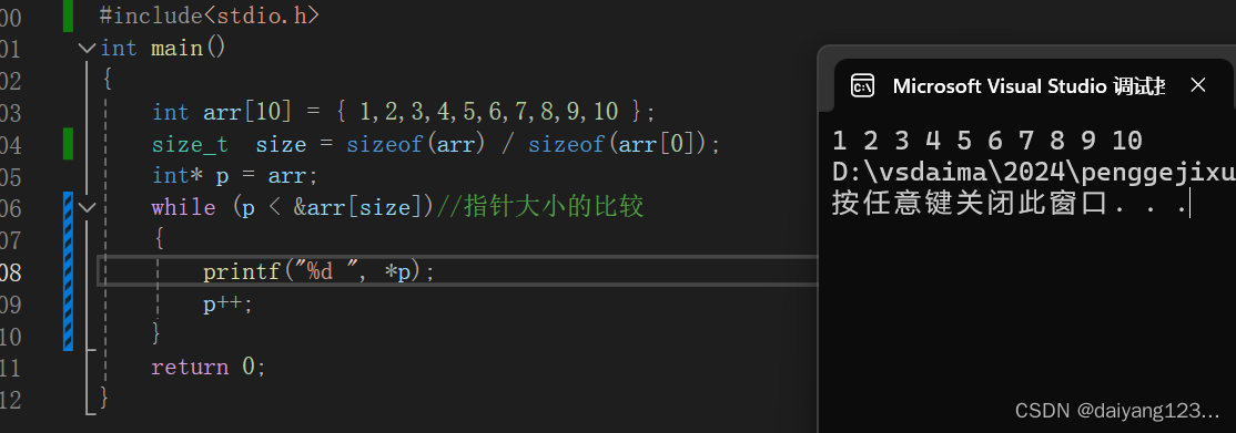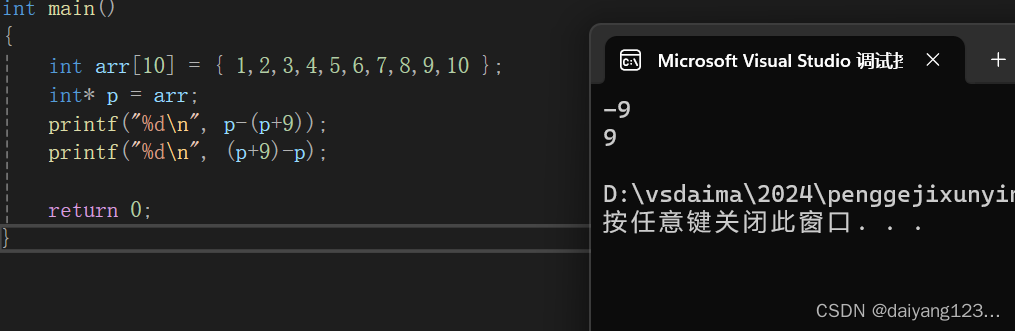 指针-指针的绝对值是指针与指针之间的元素个数 前提:两个指针之间指向同一!块空间。