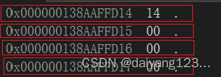 上述代码就是创建了整型变量a,内存中申请4个字节,用于存放整数20,其中每个字节都有地址,上述4个字节地址如图: