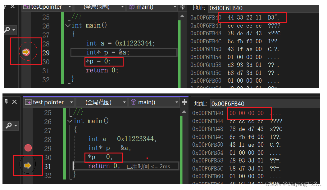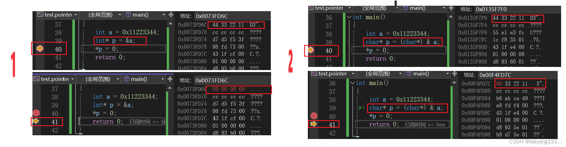 调试我们利用发下代码1会将a的4个字节都改为0,代码2将a的一个字节改为0. 结论:指针类型决定的,对指针解引用时候访问有多大的权限(一次操作几个字符)。 eg:char指针解引用只能访问1个字节,int指针解引用可以访问4个字节。