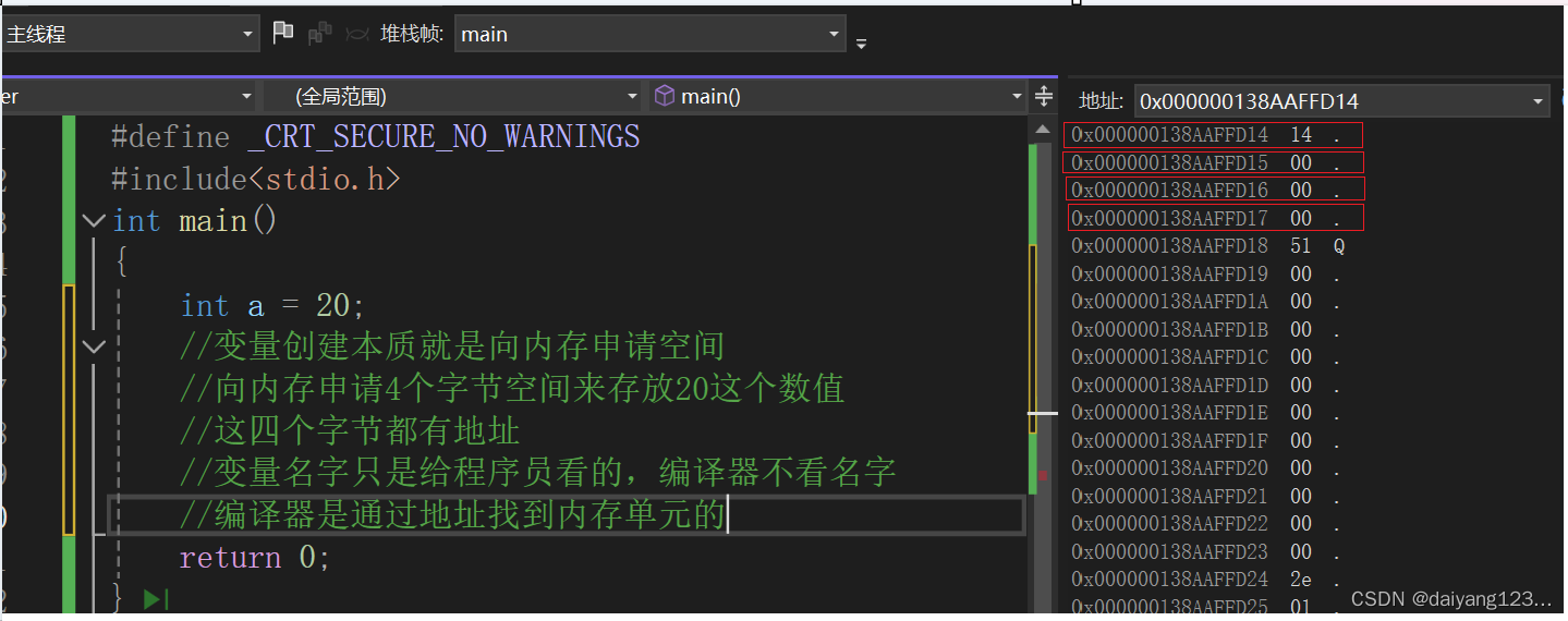 #define _CRT_SECURE_NO_WARNINGS #include<stdio.h> int main() { int a = 20; //变量创建本质就是向内存申请空间 //向内存申请4个字节空间来存放20这个数值 //这四个字节都有地址 //变量名字只是给程序员看的,编译器不看名字 //编译器是通过地址找到内存单元的 return 0; }`
