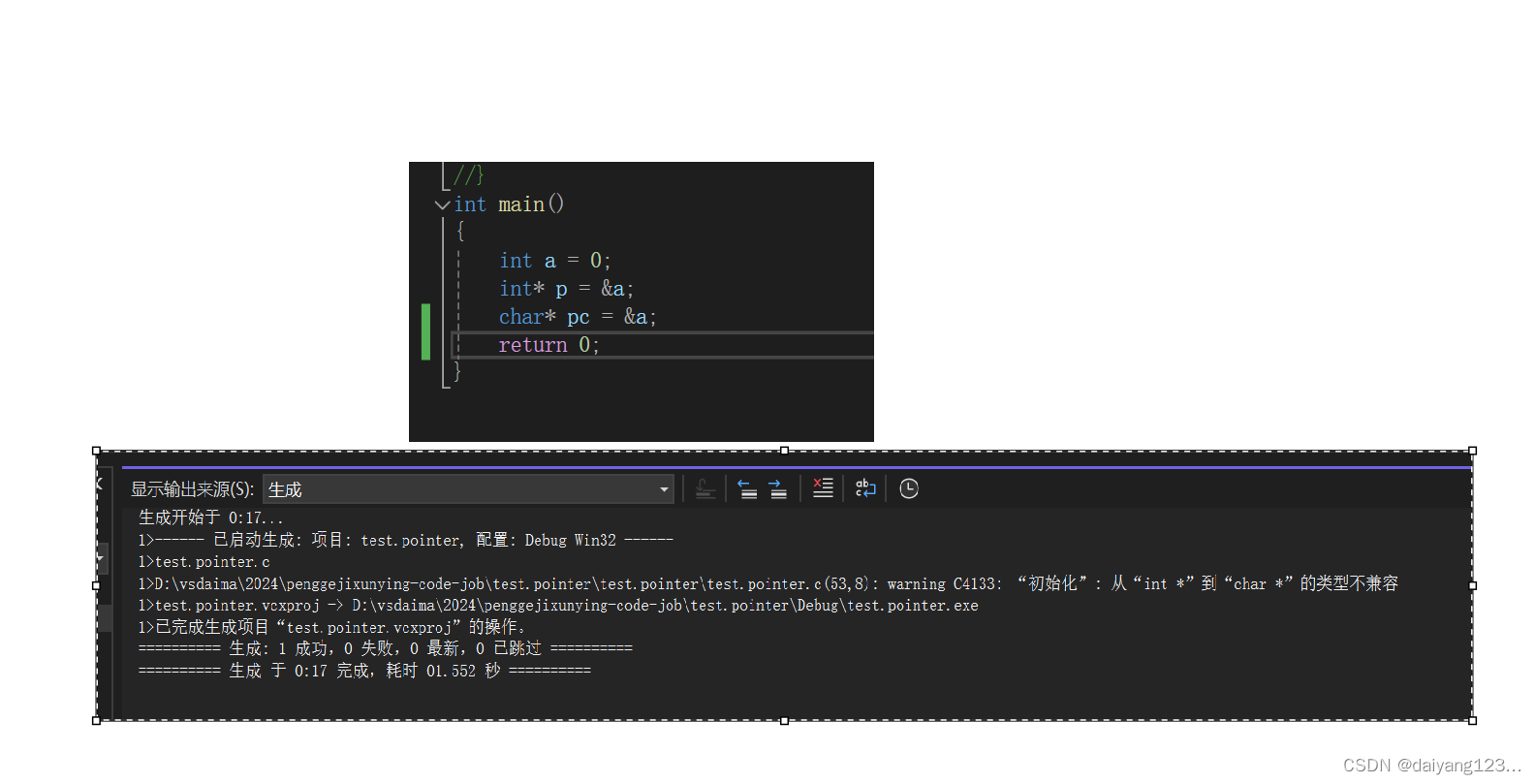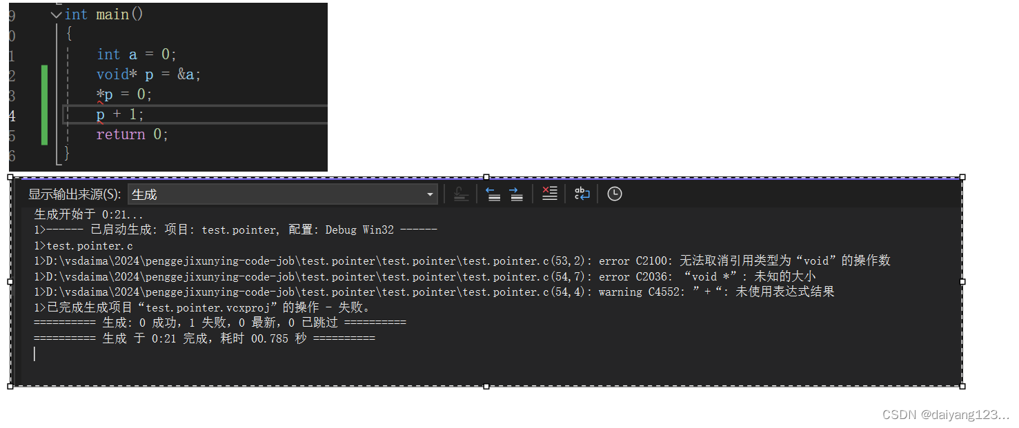 在指针类型中有一种特殊的指针类型是void* 类型的,可以理解为无具体类型的指针(或者叫泛型指针),这种类型指针可以接受任意类型的地址(指针)。但是也有局限性void*不能直接进行解引用运算和±整数。 回到编译器测试下;