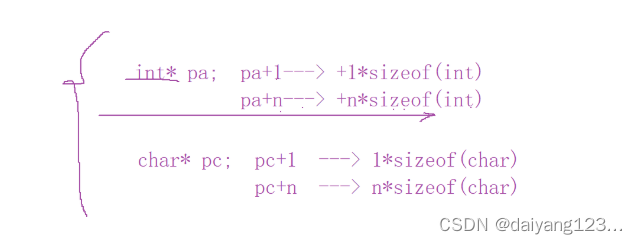 我们可以看出char指针变量+1跳过1个字节,int类型的指针变量+1跳过了4个字节,这就是指针类型变量的类型带来的差异变化,实际上指针变量±整数跳过的字节如图解释: