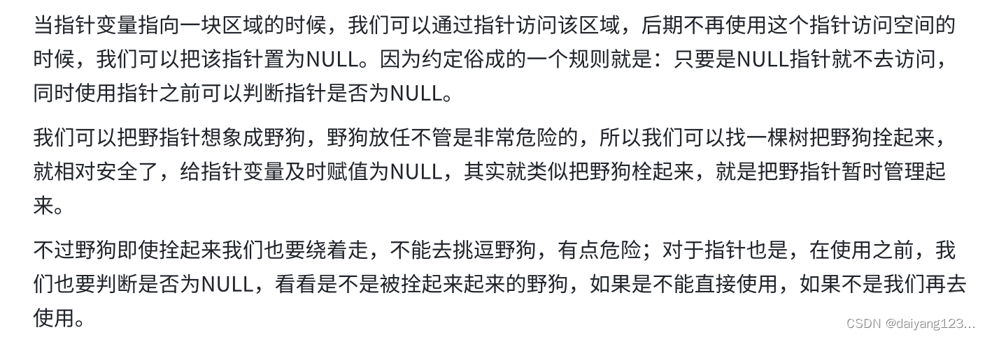 如果明确知道指针指向的位置直接赋值地址,如果不清楚指向什么位置,可以赋值NULL,NULL是C语言中定义的一个标识常量,值为0,0也是地址,这个地址是无法使用的,读写该地址会报错。