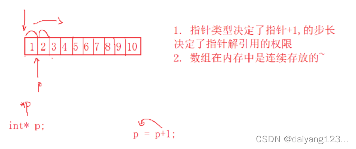 指针±整数可以运用到数组里面,因为数组是连续的存放。每个元素和每个元素都相差了sizeof(arr[0])个字节。