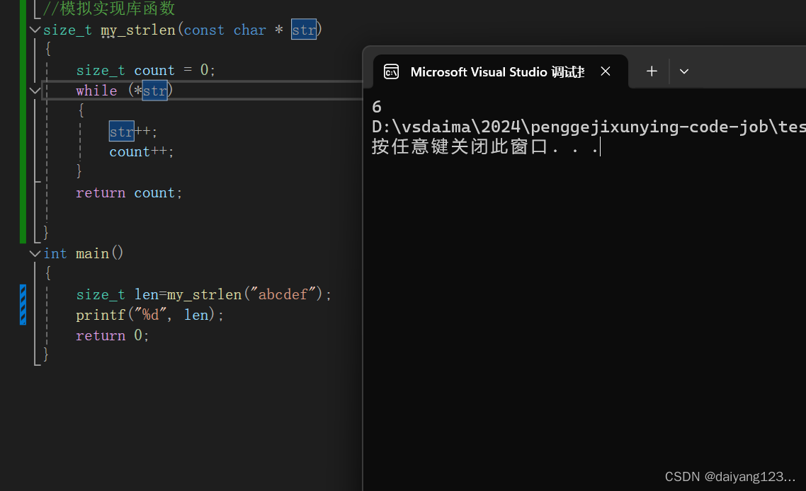 参数str接收⼀个字符串的起始地址,然后开始统计字符串中 \0 之前的字符个数,最终返回⻓度。如果要模拟实现只要从起始地址开始向后逐个字符的遍历,只要不是 \0 字符,计数器就+1,这样直到 \0 就停⽌。 参考代码如下: