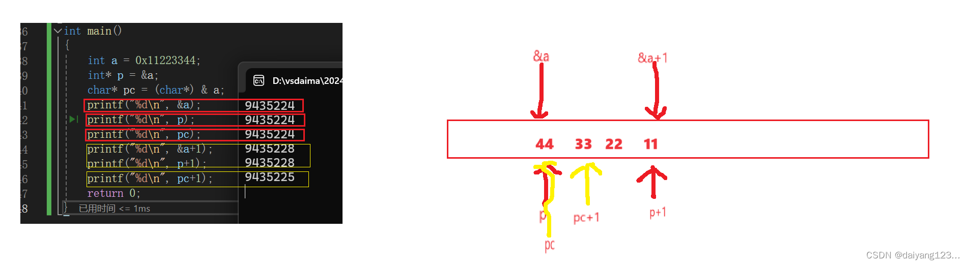 这里有的同学会产生疑问,那么取出来的地址是取四个字节的地址吗? 答案:从上述代码可以看出,&a取出来所占4个字节的中地址较小地址。虽然整型变量占用4个字节,我们知道了第一个字节的地址,顺藤摸瓜访问到4个字节数据也是可以的。