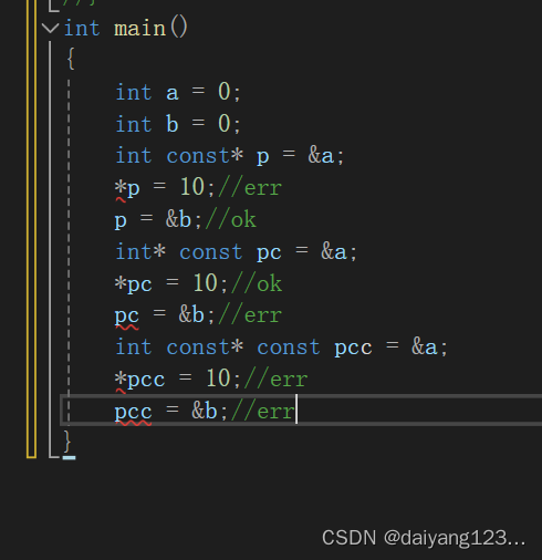 我们由此可以得出结论: (int const * p):其实const修饰的是 * p这个变量所以 *p变成了变量常量所以 解引用不可以使用。 (int * const p):其实const修饰的是 p这个变量所以 p变成了变量常量所以 p不能被修改