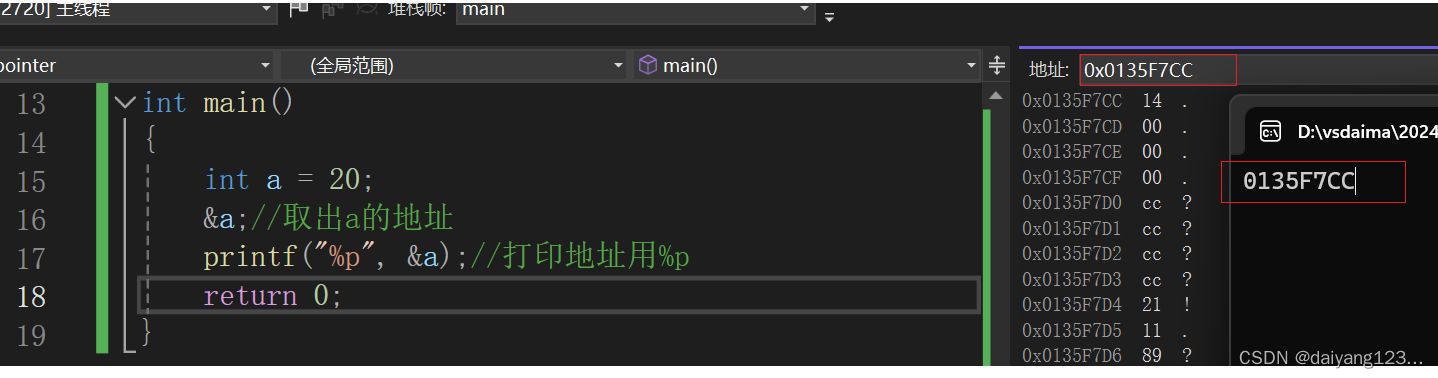 int main() { int a = 20; &a;//取出a的地址 printf(“%p”, &a);//打印地址用%p return 0; }