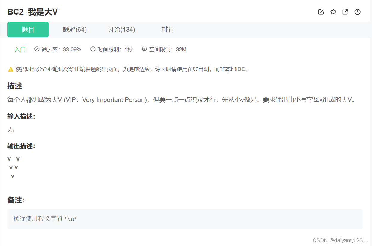 这道题也很简单:但是还是要细心,很多人直接用printf写了三行忘记了\n导致测试不通过,这道题还要注意v与v之间的空格数要不然也会导致不通过。