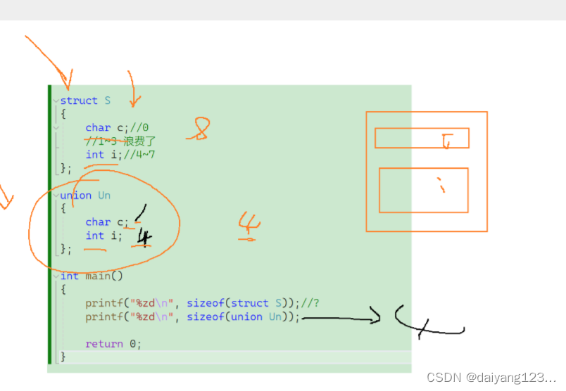 我们再对⽐⼀下相同成员的结构体和联合体的内存布局情况。