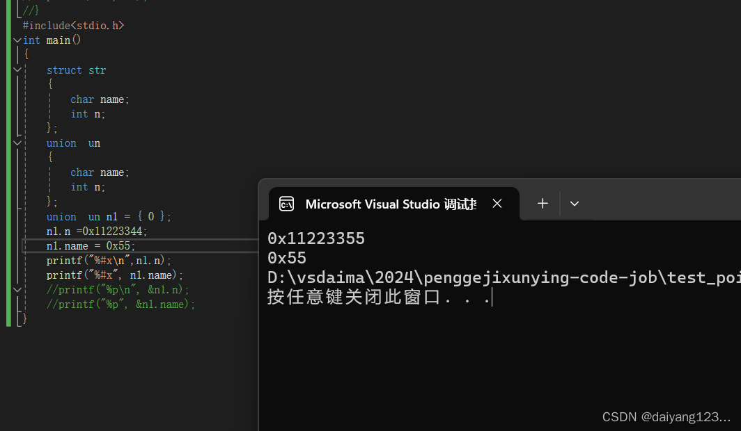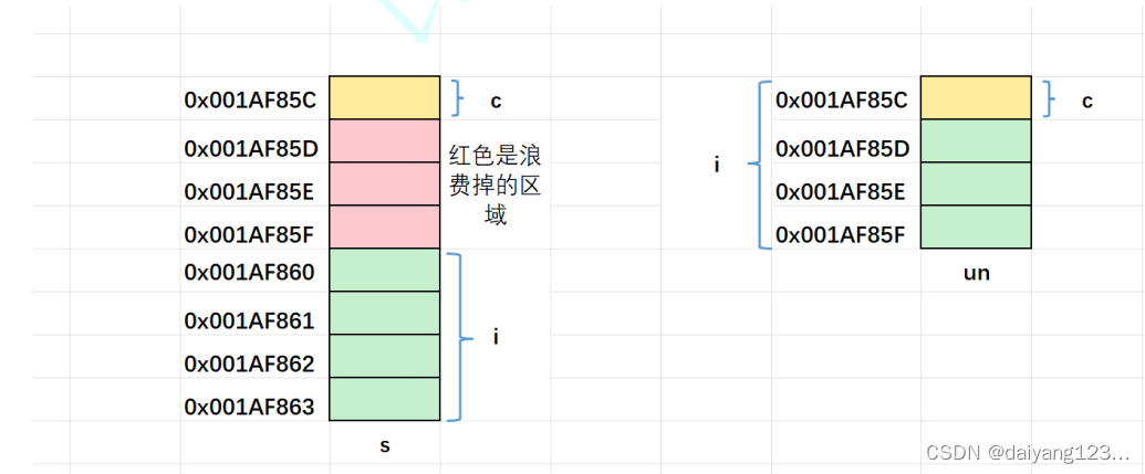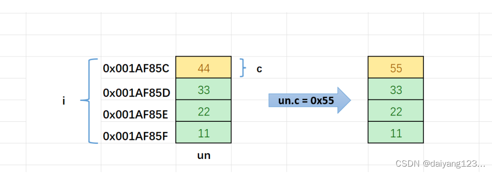 代码1输出的三个地址⼀模⼀样,代码2的输出,我们发现将i的第4个字节的内容修改为55了。 我们仔细分析就可以画出,un的内存布局图