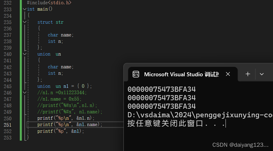 联合的成员是共⽤同⼀块内存空间的,这样⼀个联合变量的⼤⼩,⾄少是最⼤成员的⼤⼩(因为联合 ⾄少得有能⼒保存最⼤的那个成员)。 我们再打印下他们的地址