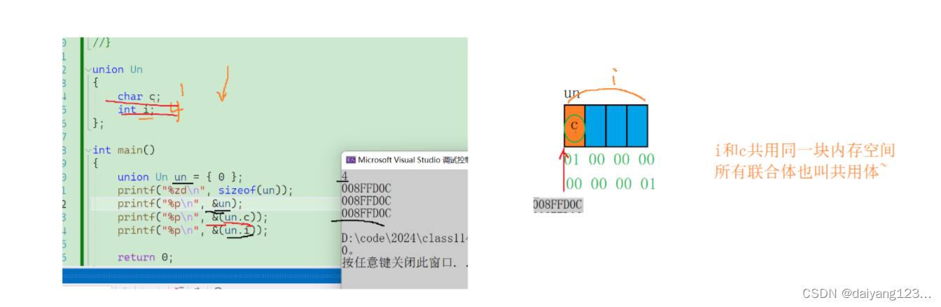 像结构体⼀样,联合体也是由⼀个或者多个成员构成,这些成员可以不同的类型。 但是编译器只为最⼤的成员分配⾜够的内存空间。联合体的特点是所有成员共⽤同⼀块内存空间。所 以联合体也叫:共⽤体。 给联合体其中⼀个成员赋值,其他成员的值也跟着变化。