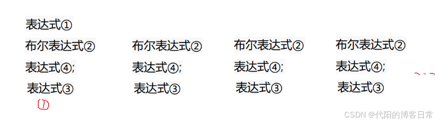 }表达式1: 用于初始化循环变量初始值设置,在循环最开始时执行,且只执行一次 表达式2: 循环条件,满则循环继续,否则循环结束 表达式3: 循环变量更新方式 【执行过程】