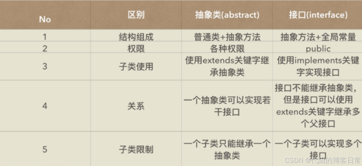 抽象类和接口都是 Java 中多态的常见使用方式. 都需要重点掌握. 同时又要认清两者的区别(重要!!! 常见面试题). 核心区别: 抽象类中可以包含普通方法和普通字段, 这样的普通方法和字段可以被子类直接使用(不必重写), 而接口中 不能包含普通方法, 子类必须重写所有的抽象方法. 如之前写的 Animal 例子. 此处的 Animal 中包含一个 name 这样的属性, 这个属性在任何子类中都是存在的. 因此此 处的 Animal 只能作为一个抽象类, 而不应该成为一个接口