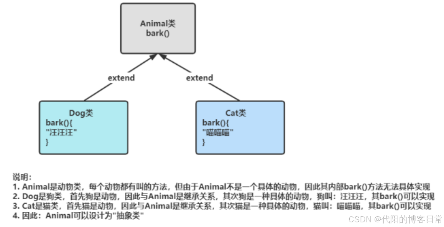 }再次提醒: 抽象类存在的意义是为了让编译器更好的校验, 像 Animal 这样的类我们并不会直接使用, 而是使用它的子类. 万一不小心创建了 Animal 的实例, 编译器会及时提醒我们.