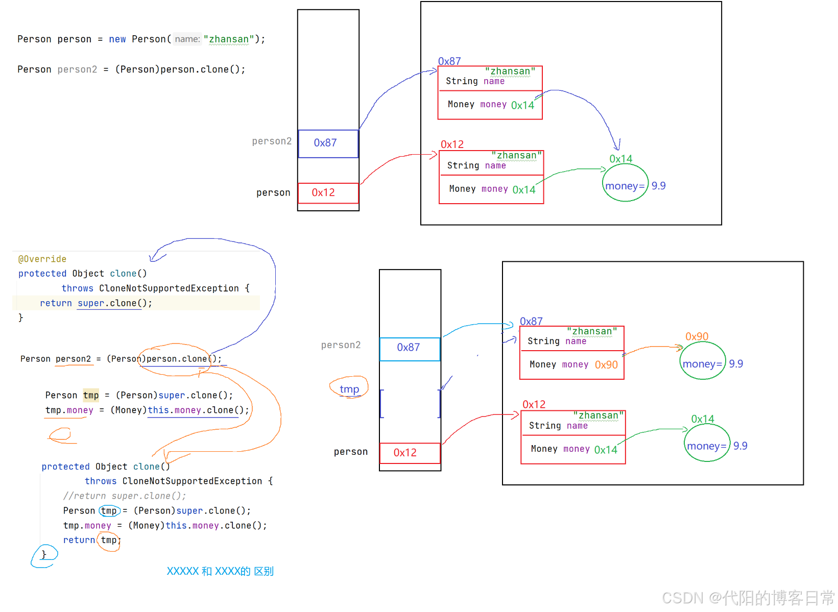 如上代码,我们可以看到,通过clone,我们只是拷贝了Person对象。但是Person对象中的Money对象,并 没有拷贝。通过person2这个引用修改了m的值后,person1这个引用访问m的时候,值也发生了改变。这里 就是发生了浅拷贝。那么同学们想一下如何实现深拷贝呢?