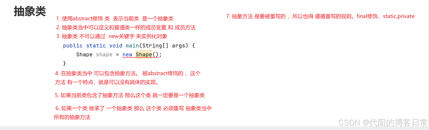 有些同学可能会说了, 普通的类也可以被继承呀, 普通的方法也可以被重写呀, 为啥非得用抽象类和抽象方法 呢?