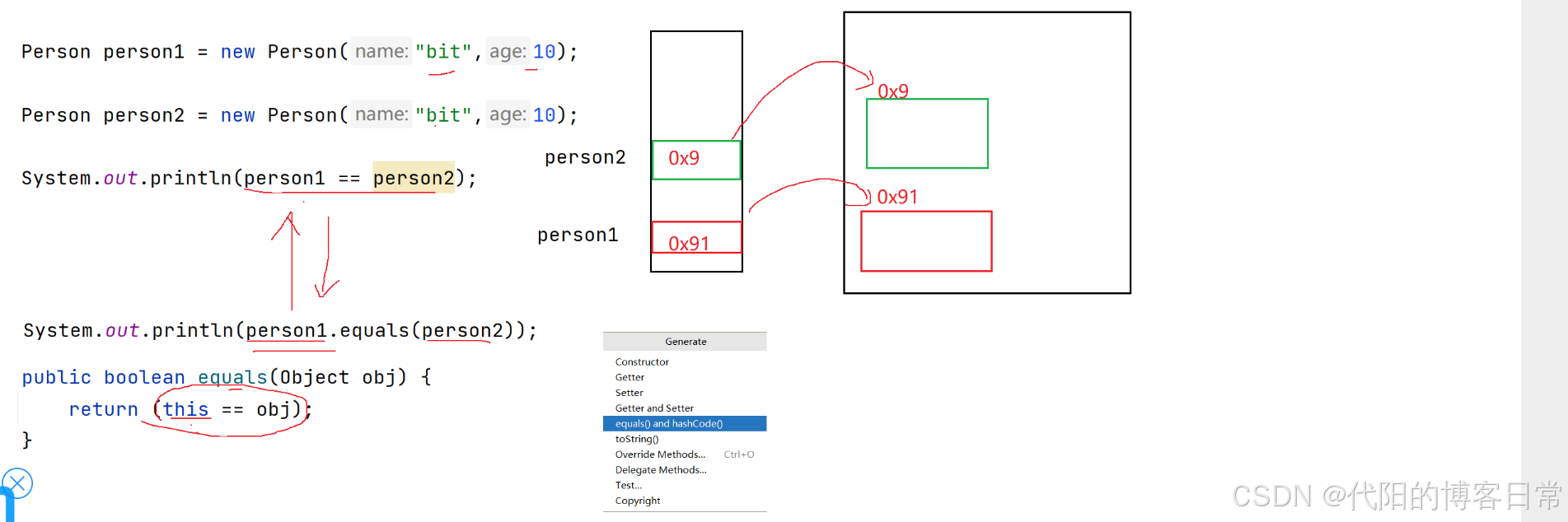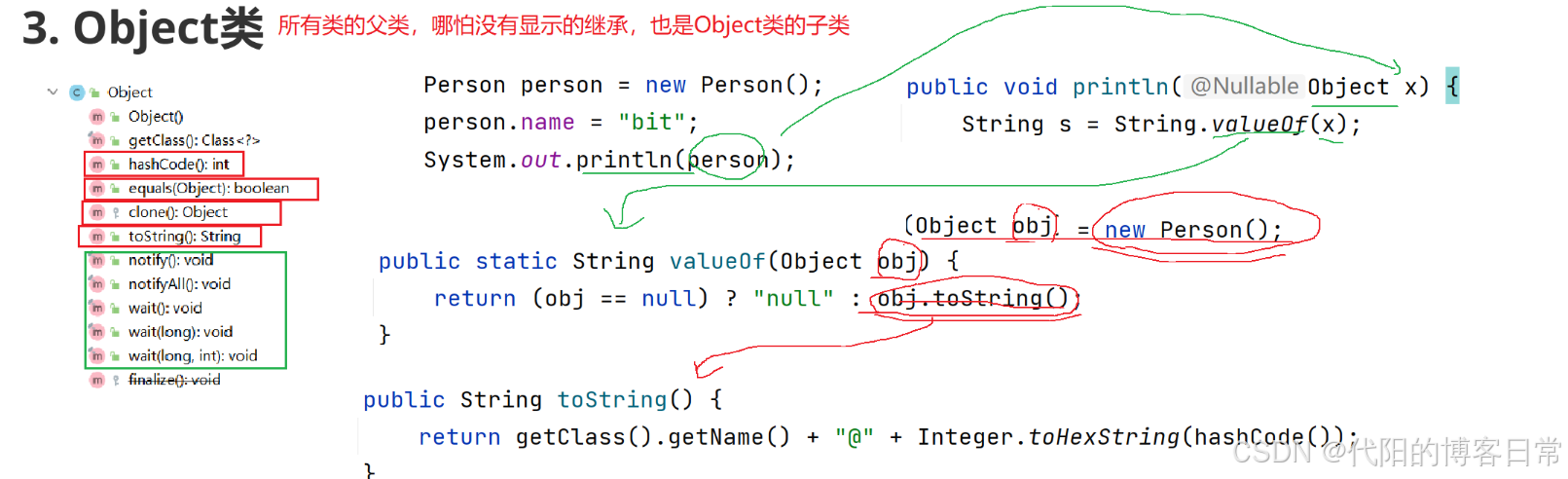 对于整个Object类中的方法需要实现全部掌握。 本小节当中,我们主要来熟悉这几个方法:toString()方法,equals()方法,hashcode()方法