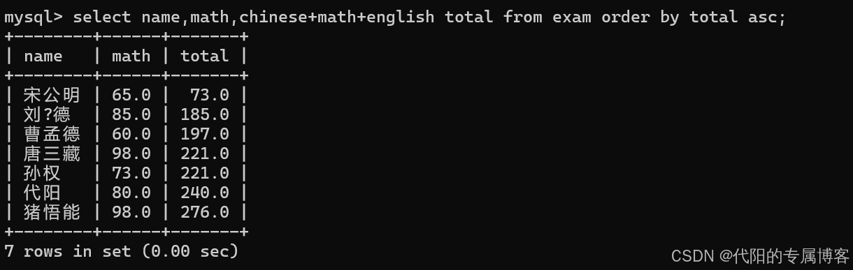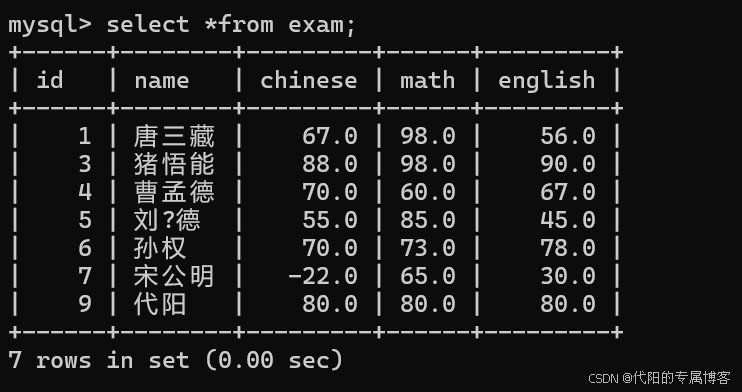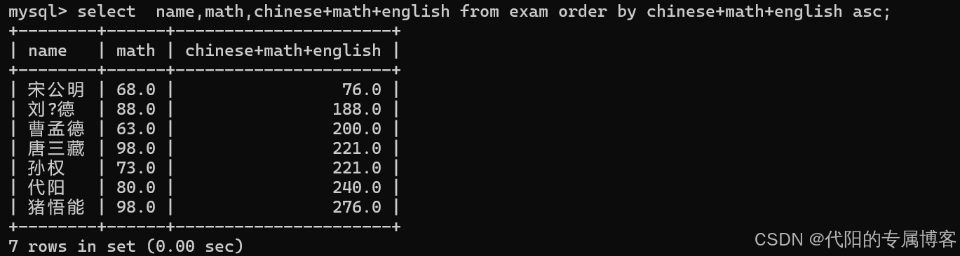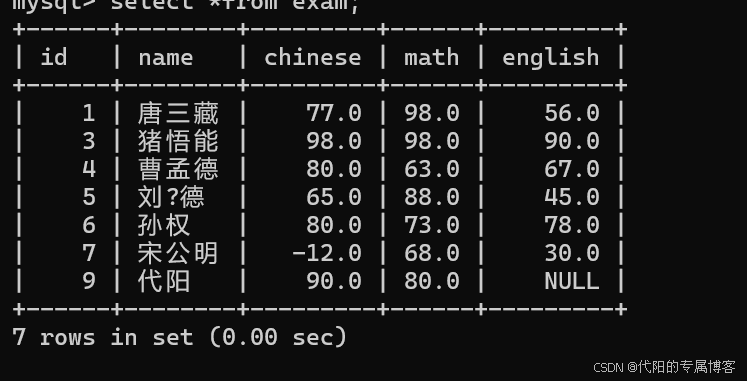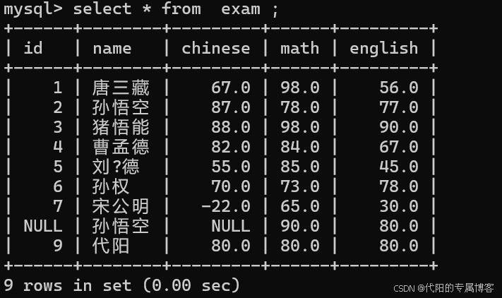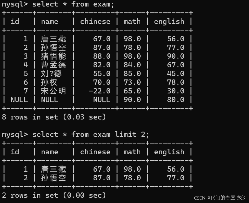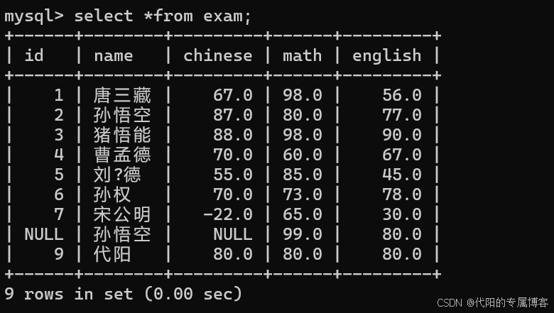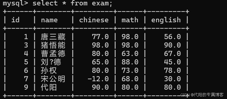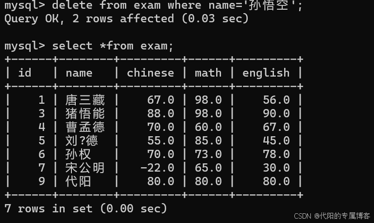 DELETE FROM tbl_name [WHERE where_condition] [ORDER BY ...] [LIMIT row_count]删除孙悟空同学的考试成绩 原表: