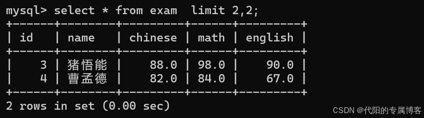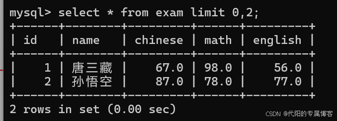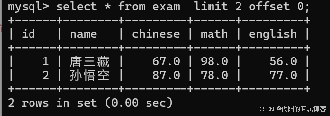 select from table_name [where...] [order by] limit num offset start;限制两条,从第0条开始,只取前两条记录
