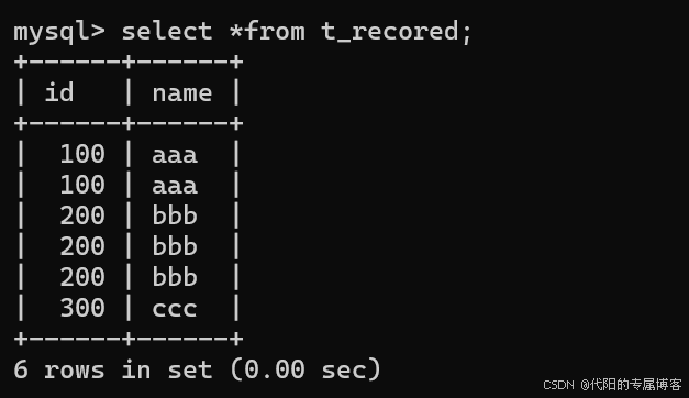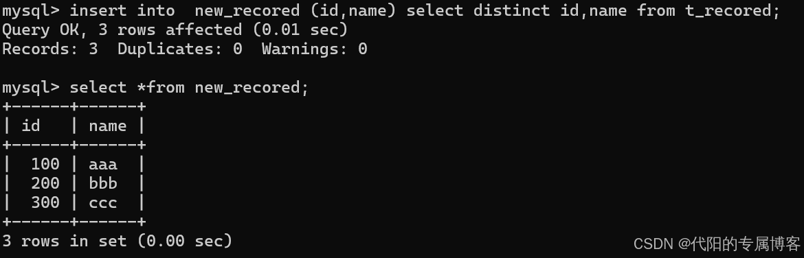 **实现思路:**原始表中的数据⼀般不会主动删除,但是真正查询时不需要重复的数据,如果每次查询 都使⽤DISTINCT进⾏去重操作,会严重效率。可以创建⼀张与 t_recored 表结构相同的表,把 去重的记录写⼊到新表中,以后查询都从新表中查,这样真实的数据不丢失,同时⼜能保证查询效 率 创建一个新表: