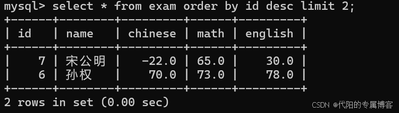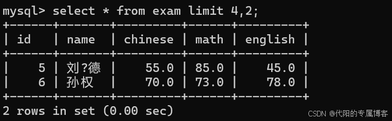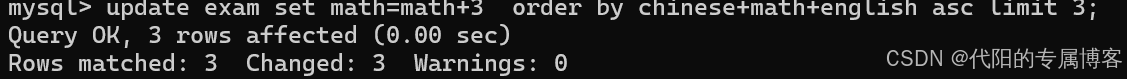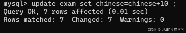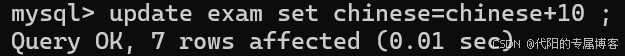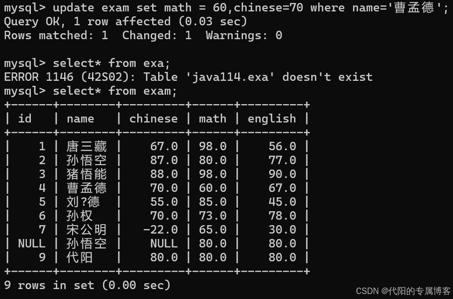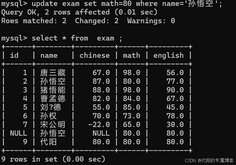 2条数据被影响,匹配两条记录,2条被更改。 将曹孟德同学的数学成绩变更为 60 分,语⽂成绩变更为 70 分